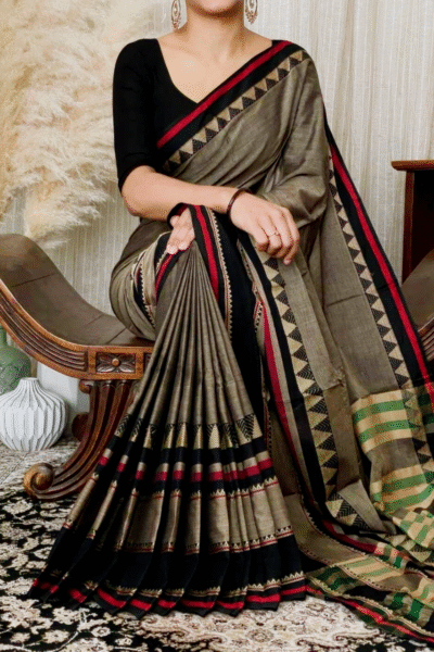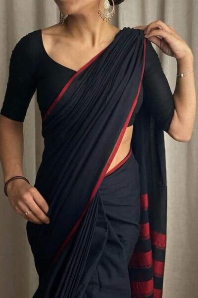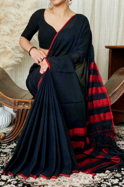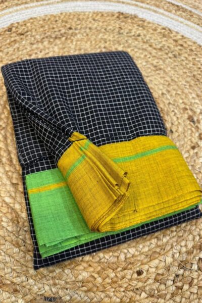 Pure 100% cotton handmade | Black Patteda Anchu saree | Green & Yellow border