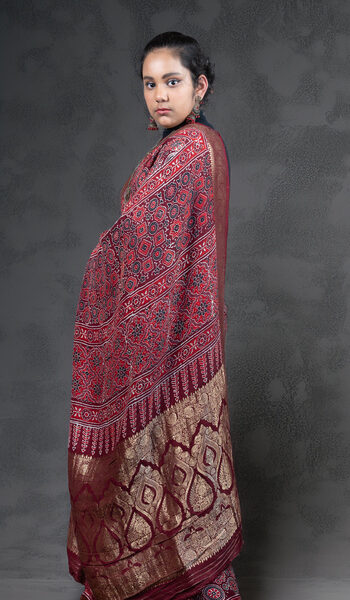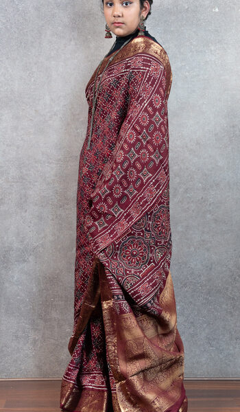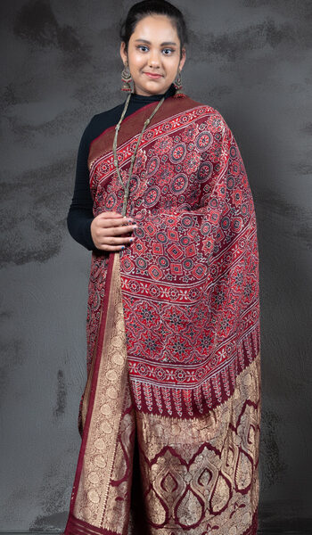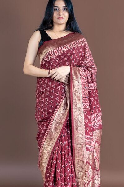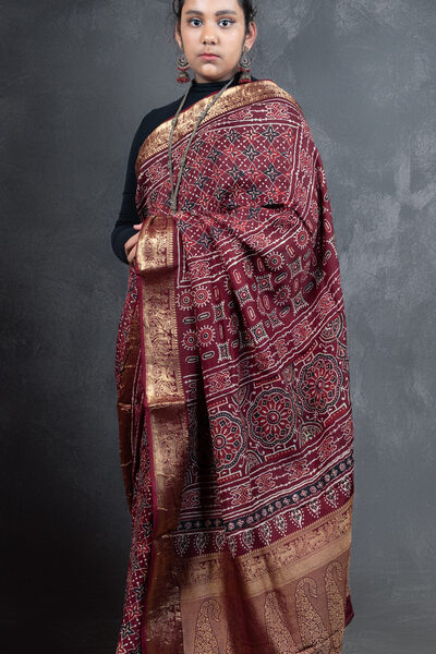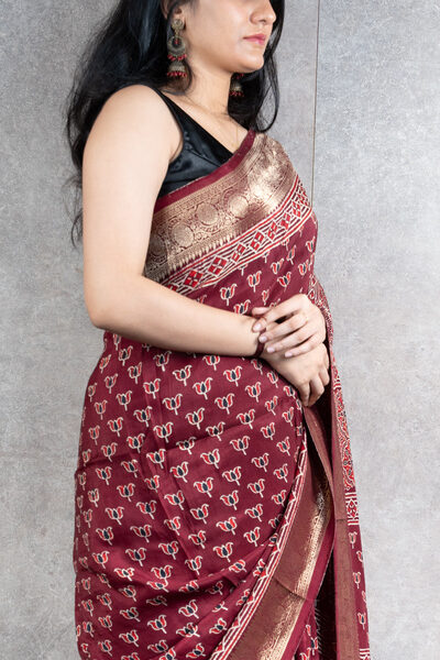 Maroon Chanderi Ajrakh Silk Saree | Handloom | Hand-Block Print with Zari border