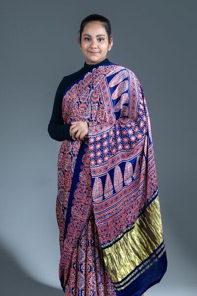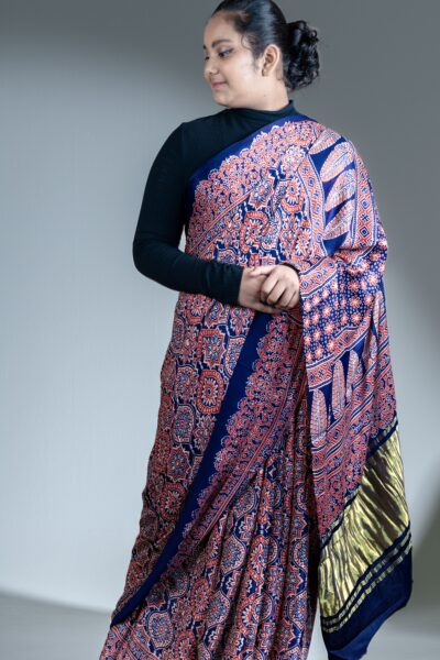 Chanderi Ajrakh Silk Saree | Blue |Handloom |block-painted motifs with Zari pallu