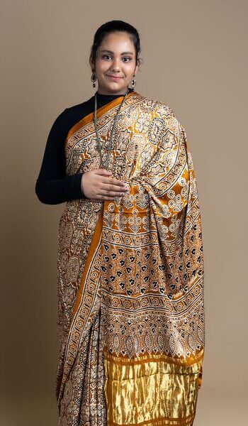 Mustard Chanderi Ajrakh Silk Saree | Maroon | Handloom | Hand-Block Print & Zari Pallu
