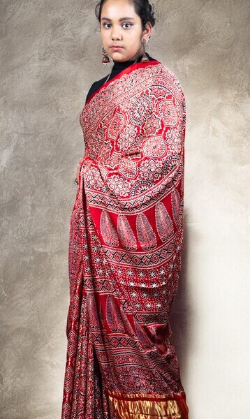 Chanderi Ajrakh Silk Saree | Red | Handloom | Hand-Block Print with Zari Pallu