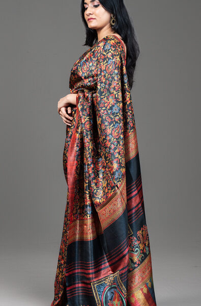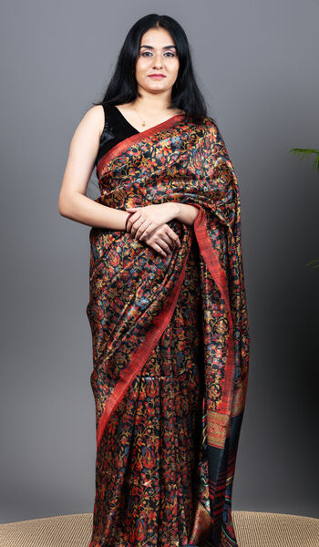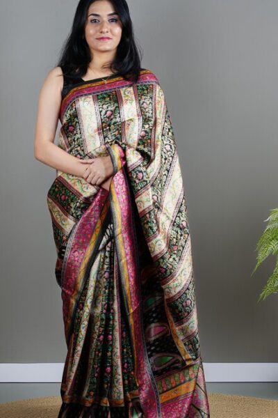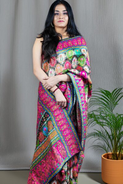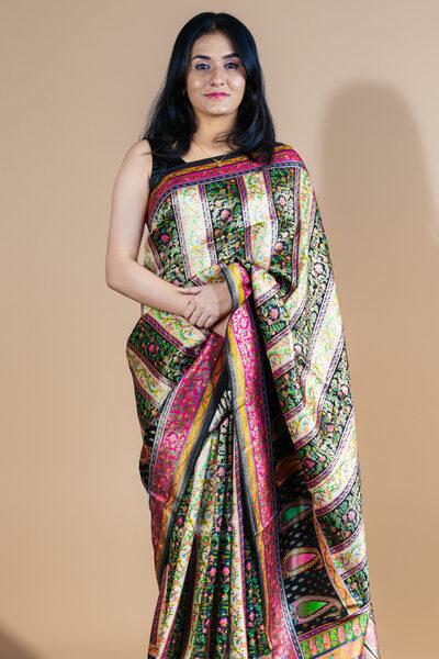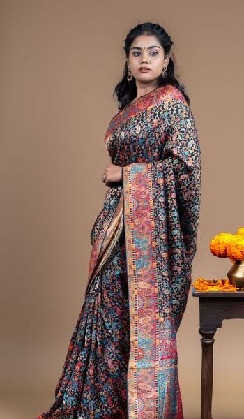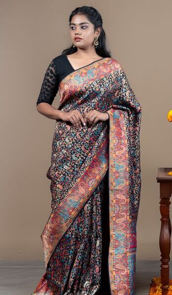 Elegant Black Kashmiri Pashmina Soft Silk Saree | Floral Jaal & Kani-Inspired Design