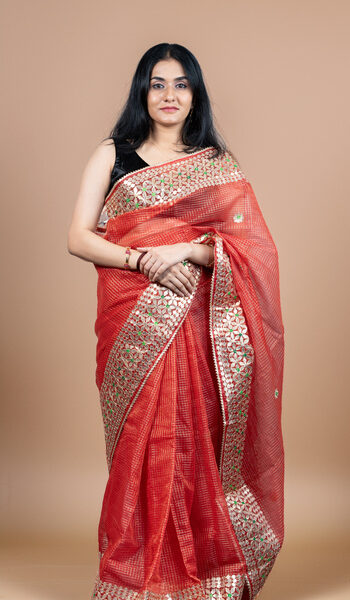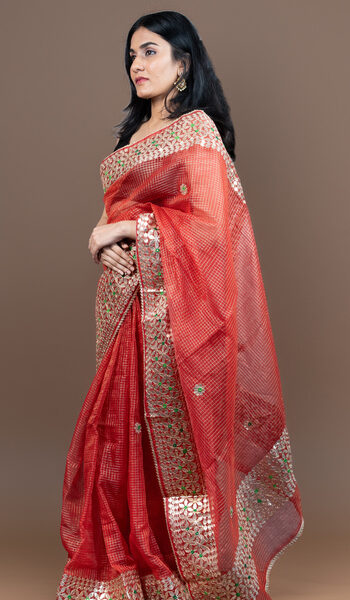 Kota Doria Gota Patti Aari Work Saree | Elegant Red Festive Wear