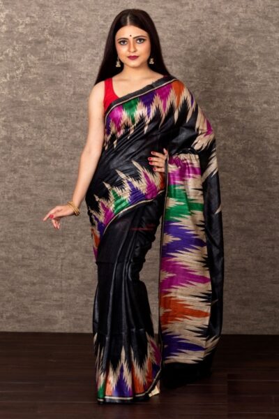 Black Kashmiri Pashmina Soft Silk Saree | Multicolour Geometric Weave