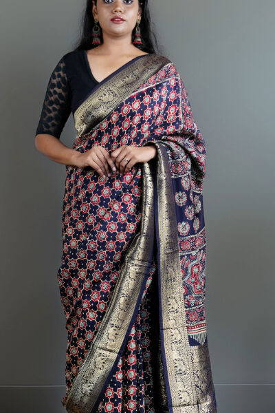 Chanderi Ajrakh Silk Saree | Blue |Handloom |block-painted motifs with Zari pallu