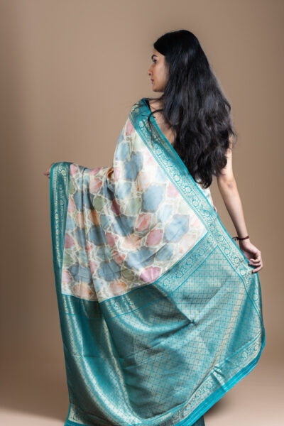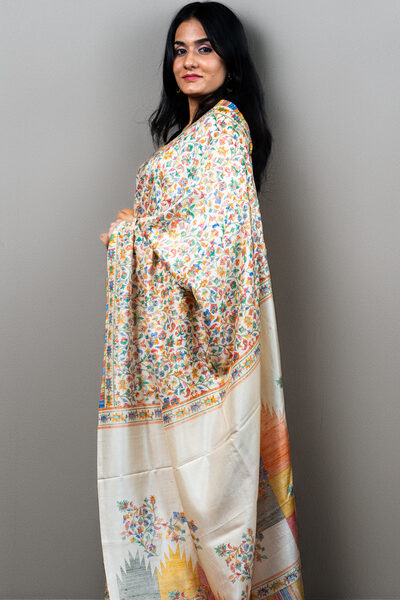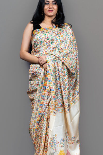 Elegant Pearl white Kashmiri Pashmina Soft Silk Saree | Floral Jaal & Kani-Inspired Design