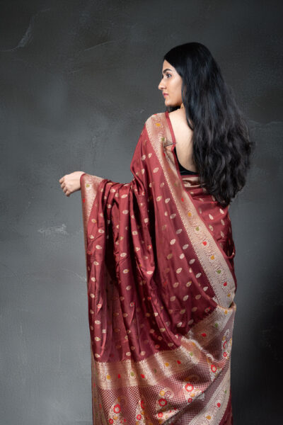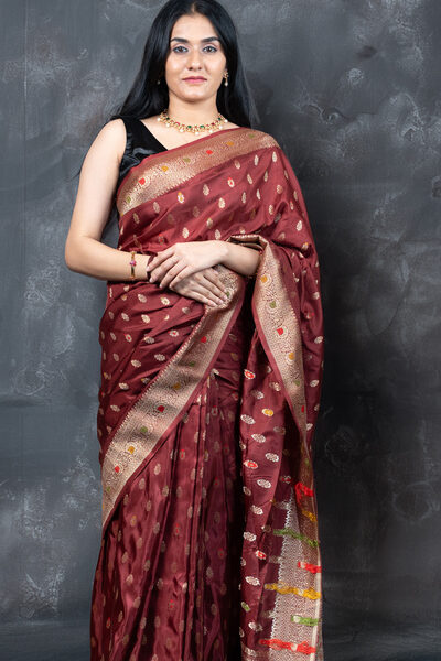 Rustic Red Banarasi Silk Saree with Meenakari Buti | Meena Work Pallu & Zari Border