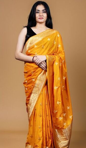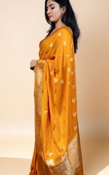 Mustard Yellow Banarasi Soft Silk Saree | Golden Motifs & Zari Border